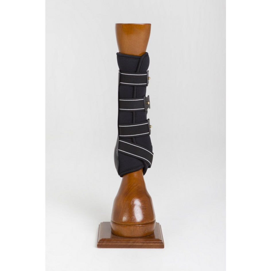 Les guêtres de travail royales postérieures sont faites de TPU (Thermoplastique polyuréthane) et laminé avec du nylon, ce qui leur donne une grande stabilité pour répartir efficacement la pression et amortir le choc. Le néoprène épais et doux à l'intérieur est perforé pour une meilleure ventilation et circulation de l'air. Cela leur permet de « respirer ». Sangles élastiques extra fortes et boutons en laiton assurent un ajustement parfait. Elles sont idéales pour l'entraînement de dressage. Parfait en combinaison avec les guêtres de travail Royales antérieures. Disponible dans les couleurs noir, blanc et marron. Tailles : M Cob et L Full.