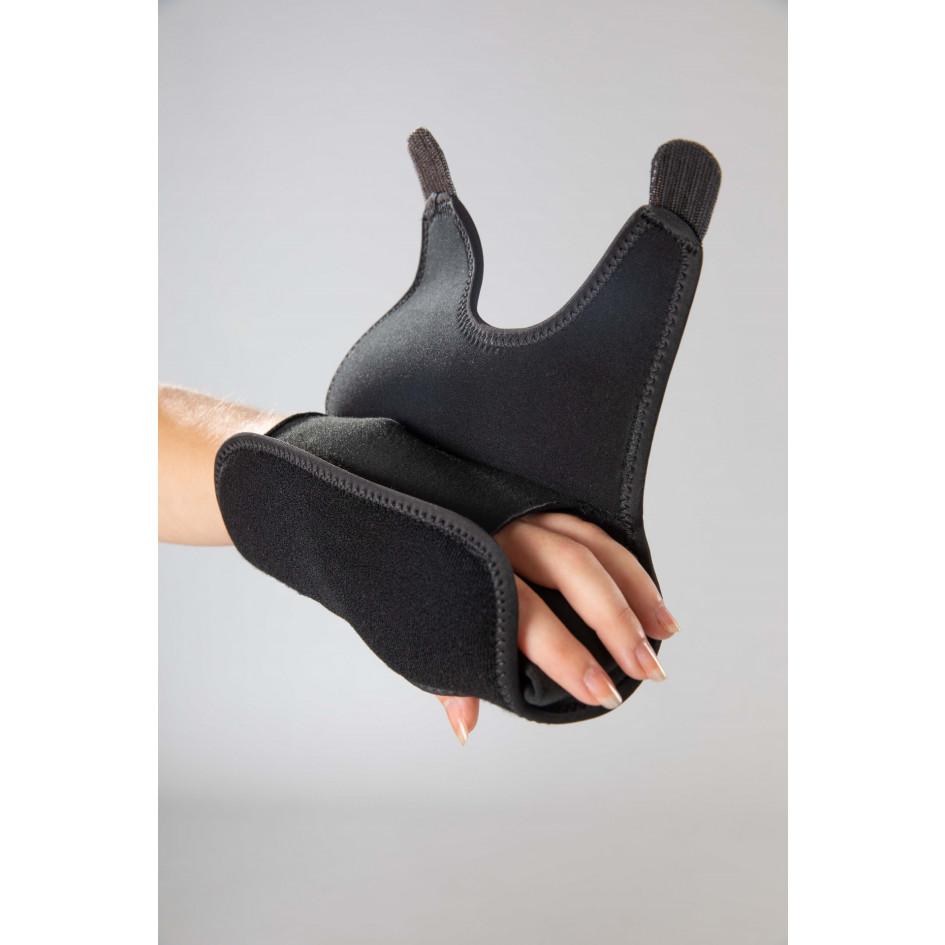 Coussin moelleux dans la paume, rempli de perles pour créer un ajustement personnalisé et une position naturelle de la paume. Attelles intégrées faciles à enlever pour maintenir une bonne position pendant le sommeil. Facile à enfiler et à adapter avec fermeture velcro.