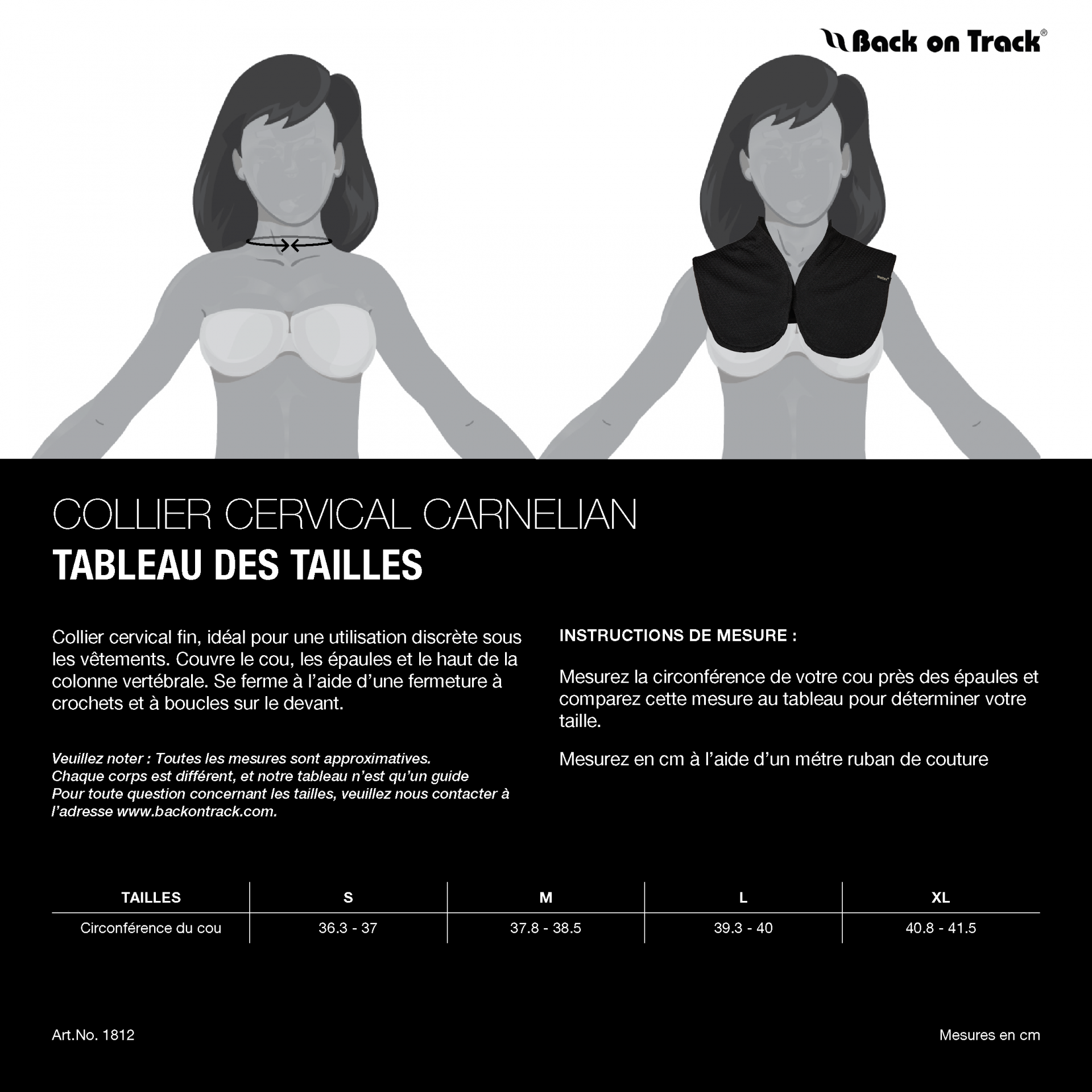 Mesurez la circonférence de votre cou près des épaules, mesurez en cm à l'aide d'un metre ruban. S 36,3 -37 cm - M 37,8 -38,5 cm - L 39,3 - 40 cm - XL 40,8 -41,5 cm