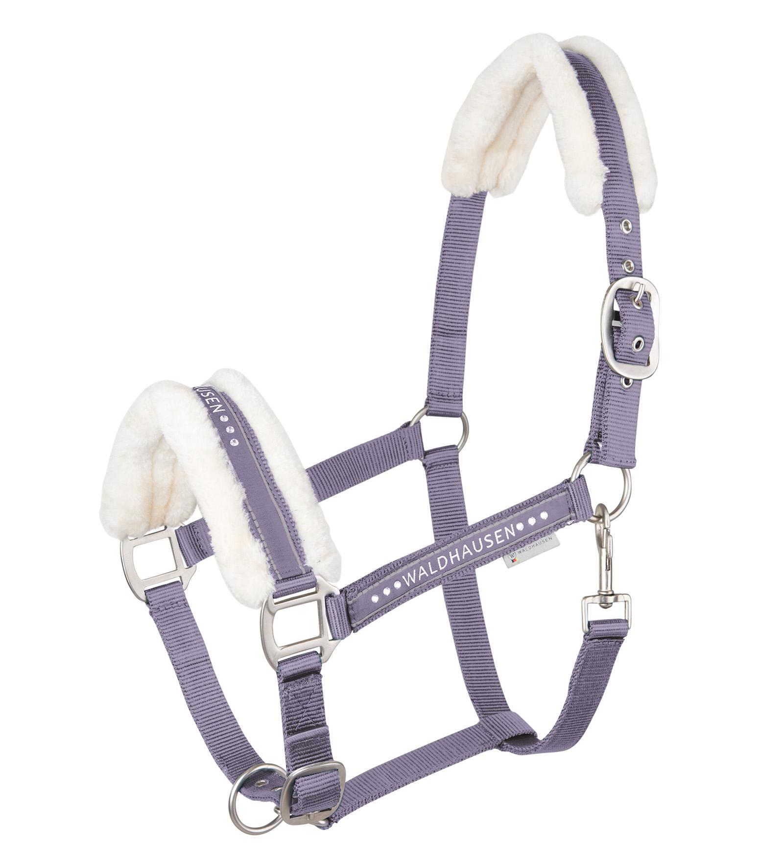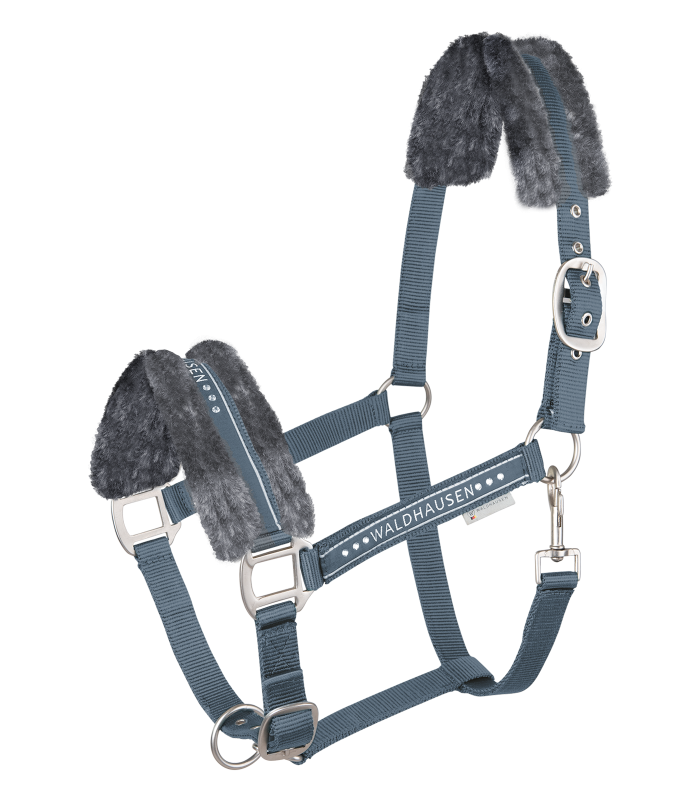 Licol moelleux avec bande Waldhausen et bouclerie mate. Muserolle ornée de cristaux scintillants. Matelassure douce en fourrure synthétique à la têtière et muserolle. Réglage multiple au menton et à la nuque.